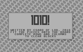 1010! von Legion Of Doom ist ein neues Casual-Puzzle-Spiel für den C16. Das Konzept ist einfach und anspruchsvoll. Alle Blöcke müssen auf dem Brett so angeordnet werden, dass diese eine horizontale oder vertikale Reihe ergeben, danach lösen sich diese in Tetris-Manier auf. Die Schwierigkeit entsteht nun dadurch, dass die übrig gebliebenen Blockfragmente das dazulegen weiterer neuer Blöcke erschwert!
