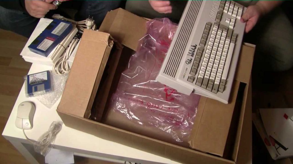 Sven Vößing und Jo Hesse entpacken einen neuen Amiga 1200 aus einem Altlagerbestand!